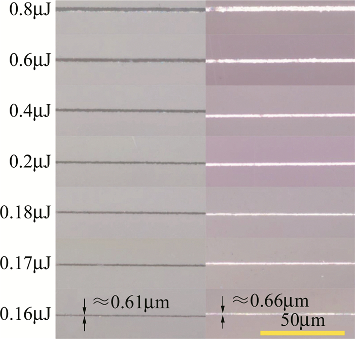激光直寫刻蝕玻璃方法,按激光波長不同主要分為紅外和紫外激光刻蝕法,而按照激光脈寬不同則可分為:連續激光刻蝕;納秒、皮秒及飛秒激光刻蝕。YANG等人使用248nm深紫外準分子激光在石英玻璃表面刻蝕微通道,試驗中發現激光能量密度是決定石英玻璃發生刻蝕及裂損的主要因素,無裂損刻蝕石英玻璃的激光能量密度閾值區間應在16J/cm2~30J/cm2;而掃描次數的增加、重復頻率和微通道深度的增大也會加劇微通道的裂損程度,最后通過加工參量的優化(激光能量密度23.5J/cm2,圓弧段重頻為50Hz,直線段重頻為40Hz,掃描1)實現了寬度小于100μm的直線型(深度不大于50μm)和圓弧型微通道(深度不大于28.5μm)的無裂損刻蝕。LI等人利用波長為355nm, 脈寬為10ns~25ns的全固態紫外激光器直寫刻蝕BF33硼硅玻璃微通道,試驗中采用單一變量法探究激光能量密度、重復頻率、掃描速率等參量對刻蝕效果的影響,試驗結果表明,當激光能量密度過大時,玻璃易發生嚴重崩邊裂損現象,刻蝕深度減小;而隨著重復頻率的減小,通道碎裂現象減輕,刻蝕深度增大。YU等人采用波長為1030nm、脈寬和重復頻率分別為290fs, 50kHz的飛秒激光器在石英玻璃樣品上刻蝕線寬小于1μm的凹槽圖案以制備亞微米金屬線,研究了不同脈沖能量激光與燒蝕凹槽及機械拋光后的金屬線的線寬之間的關系,如圖 1所示。結果表明,當脈沖能量在0.18μJ以下時,凹槽線寬已降低至1μm以下,最終在石英玻璃上制備出多種不同圖案且線寬穩定控制在0.8μm左右的凹槽。