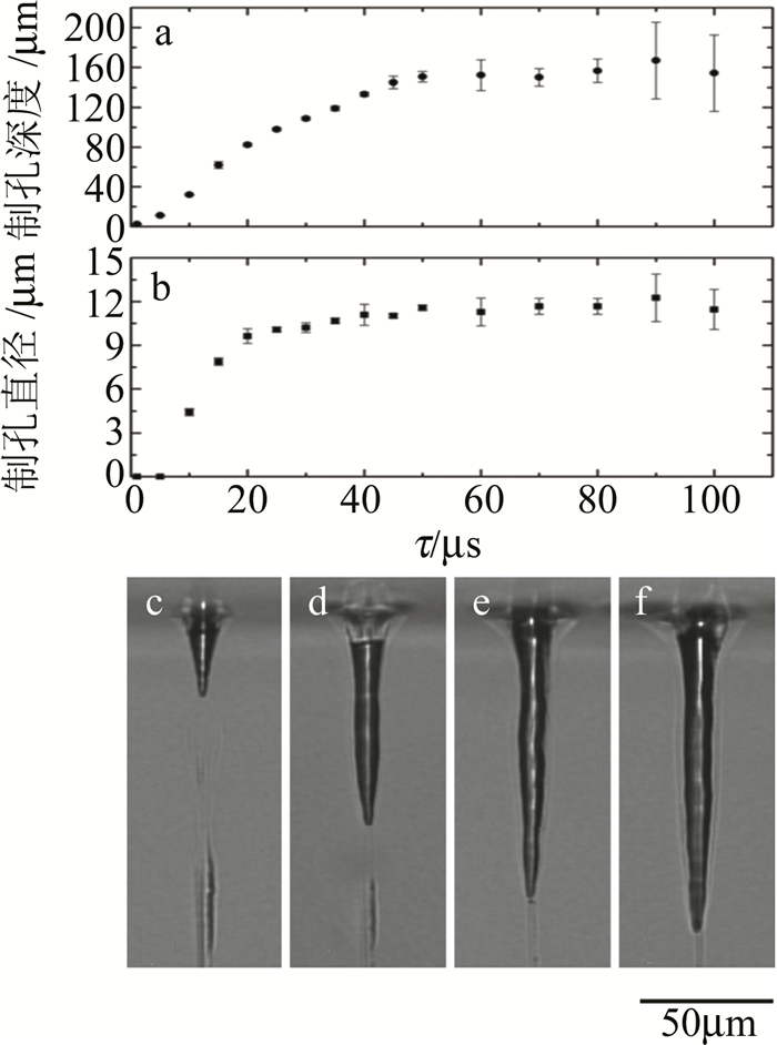 針對激光打孔過程中玻璃崩邊及裂紋現象嚴重,高深徑比微孔加工難度大的瓶頸問題,許多學者提出了改進的打孔方法。為了減少微孔加工時裂紋的產生,KONO等人將二氧化鈰粉末和水的混合物涂覆到玻璃材料的表面后,晾干制成30μm的吸收層,之后再用波長為355nm的納秒激光器進行微孔加工,成功在硼硅玻璃和石英玻璃上分別加工出深徑比12以上的微孔,通過對照試驗還發現該方法可以大大減少裂紋的產生,并在不影響加工質量的前提下提高加工速度(XY工作臺進給速率高達100μm/s)。針對飛秒激光打孔制孔速度低、制孔時易產生損傷的問題,ITO等人[19]將波長為780nm的飛秒激光器與波長為1070nm的光纖激光器相結合,如圖 8a所示,加工時首先使用飛秒激光在玻璃基板上加工出高寬深比的細線,之后將光纖激光輻照到細線上逐步獲得所需的微孔(其中在飛秒激光輻照后的光纖激光輻照時間定義為時間延遲τ,如圖 8b所示), 研究發現, 飛秒激光產生的細線會選擇性地吸收光纖激光脈沖利用熱效應去除材料,可以有效地避免直接飛秒激光加工過程產生的強應力波對材料的損傷,制孔的直徑和深度與τ有關,如圖 9所示。試驗結果表明,該方法在40μs內加工出了直徑為10μm、深度達133μm的微孔,制孔速度只采用飛秒激光加工的5000倍以上, 且能有效地抑制裂紋的產生。為了解決傳統打孔由上至下的加工方式制孔時出現的坡度效應(制孔開口表現出入口大出口小的特征)WANG等人[20]提出在加工透明材料時,嘗試采用由下至上的打孔方式代替常規的由上至下方式,將激光透過材料聚焦于材料的下表面,由底部開始一層層地將材料向上去除, 試驗中分別采用波長為532nm的納秒激光、波長為1064nm的皮秒激光及波長為515nm的飛秒激光在康寧大猩猩玻璃上加工孔徑為100μm~120μm、深度為200μm~900μm的微孔, 試驗結果表明,在采用由下至上的加工方式時,脈寬區間不存在死亡谷(自納秒開始,脈寬愈短,材料移除率愈低,在2ns~50ps之間移除率非常低),脈寬為2ns~50ps的激光切割效率高于超快激光,能夠實現零錐度鉆孔且玻璃的崩邊尺寸小于50μm