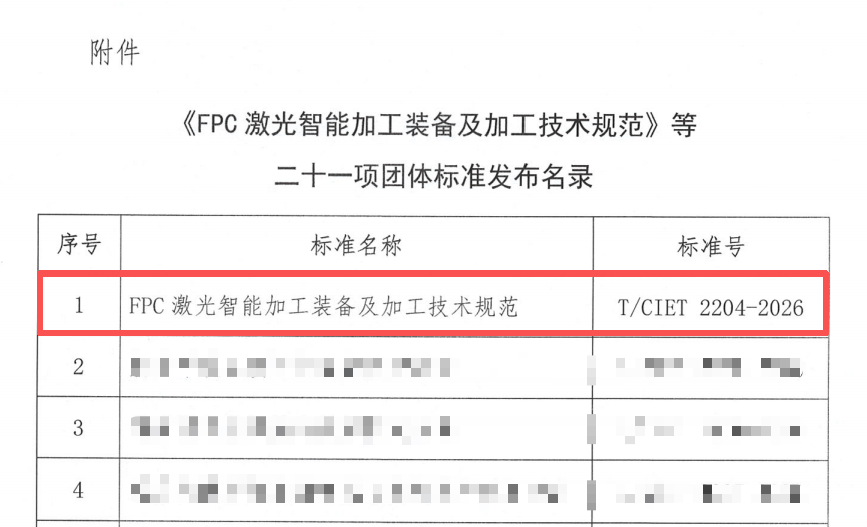 近日,由中國國際經濟技術合作促進會標準化工作委員會(以下簡稱“國促會標委會”)聯合通標中研標準化技術研究院共同組織的《FPC激光智能加工裝備及加工技術規范》團體標準正式發布,該標準由武漢元祿光電技術有限公司牽頭起草,多家業內企業及高校共同參與制定,此次發布的團體標準系統界定了FPC激光智能加工裝備的定位精度、設備穩定性等關鍵性能指標,助力行業實現高精度、高效率、綠色化制造。